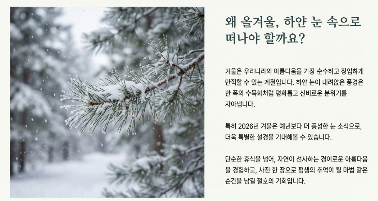 2026년 새해를 맞아 겨울 여행 계획 세우는 분들 많으시죠? 저는 매년 이맘때쯤이면 하얀 눈으로 뒤덮인 아름다운 풍경을 찾아 국내 곳곳을 여행하곤 해요. 특히 올해는 눈 소식이 더 반가워서 그런지, 그림 같은 설경을 마주할 생각에 벌써부터 마음이 두근거립니다.