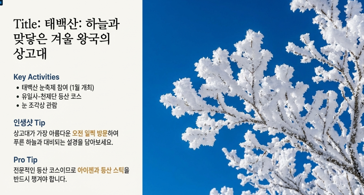 - 추천 액티비티: 태백산 눈축제 참여 (2026년 일정 확인), 유일사-천제단 등산 (아이젠, 스틱 필수), 눈썰매.