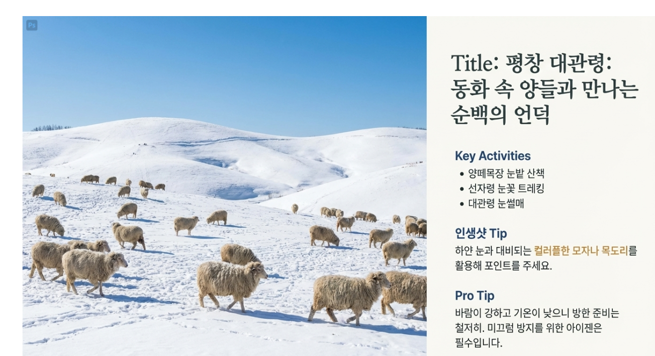 - 추천 액티비티: 양떼목장 눈밭 산책, 선자령 눈꽃 트레킹 (아이젠 필수), 대관령 눈썰매.