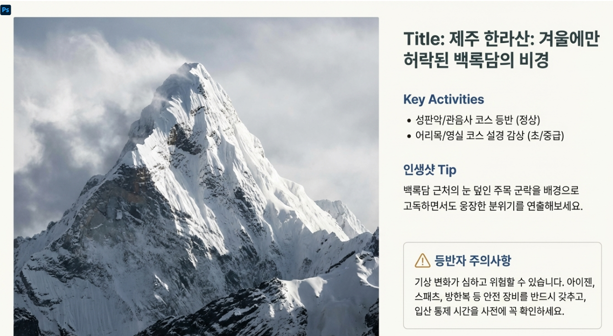 - 추천 액티비티: 한라산 등반 (성판악, 관음사 코스), 어리목/영실 코스 설경 감상.