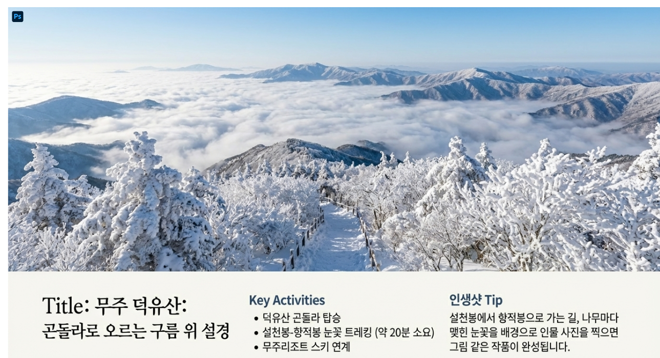 - 추천 액티비티: 덕유산 곤도라 탑승, 향적봉 눈꽃 트레킹, 무주 스키장 이용.