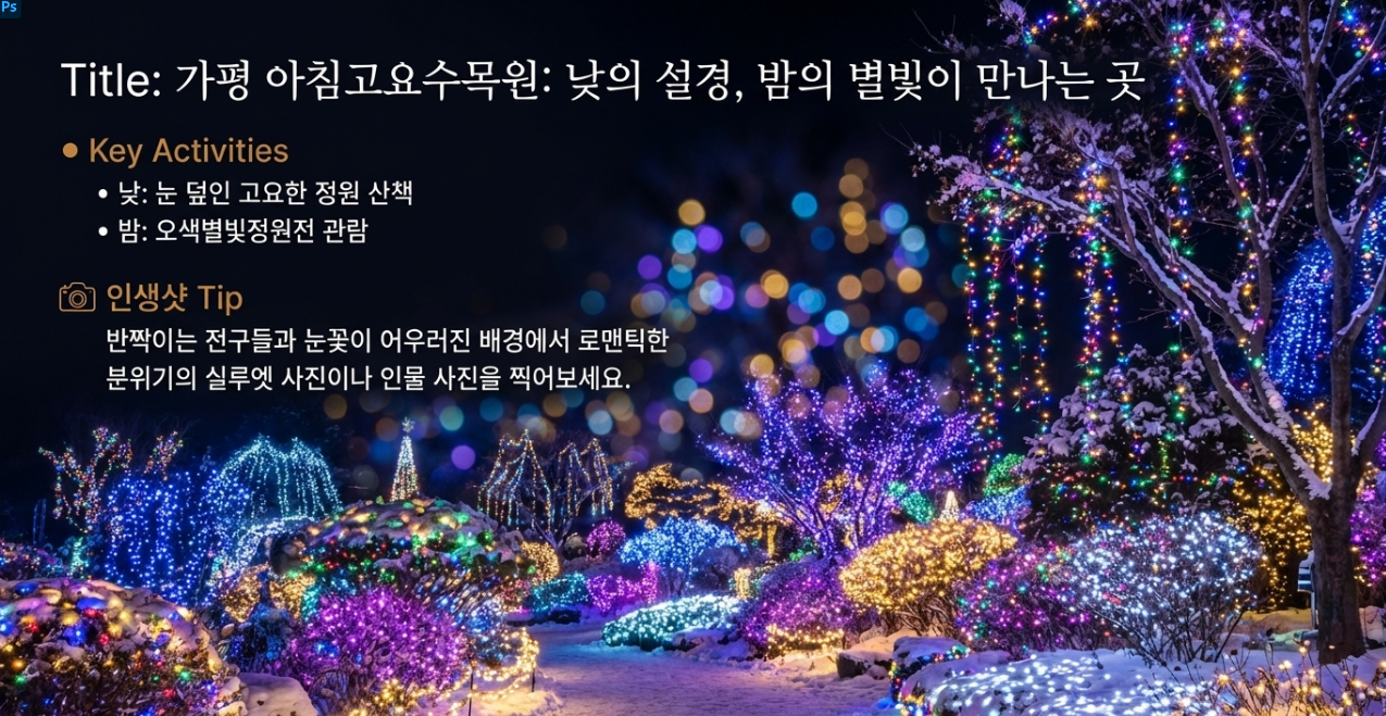 - 추천 액티비티: 낮에는 설경 감상, 밤에는 오색별빛정원전 관람.