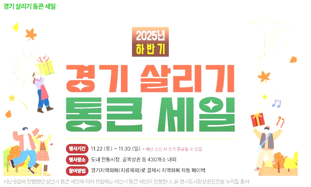 11월에는 상권 회복을 돕기 위한 하반기 통큰 세일이 9일간 진행되며, 전통시장·골목상권을 중심으로 최대 20% 환급, 최대 3만 원 혜택, 지역화폐 자동 페이백이 제공됩니다.