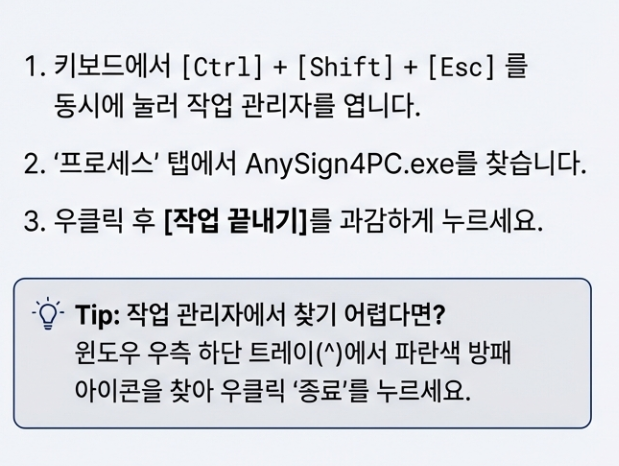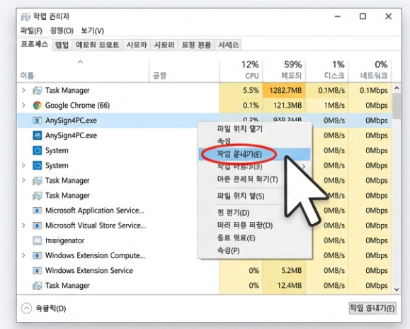 - '프로세스' 탭이나 '세부 정보' 탭에서 영문으로 AnySign4PC.exe라고 적힌 항목을 찾으세요. (눈 크게 뜨고 찾아보세요! 👀)
