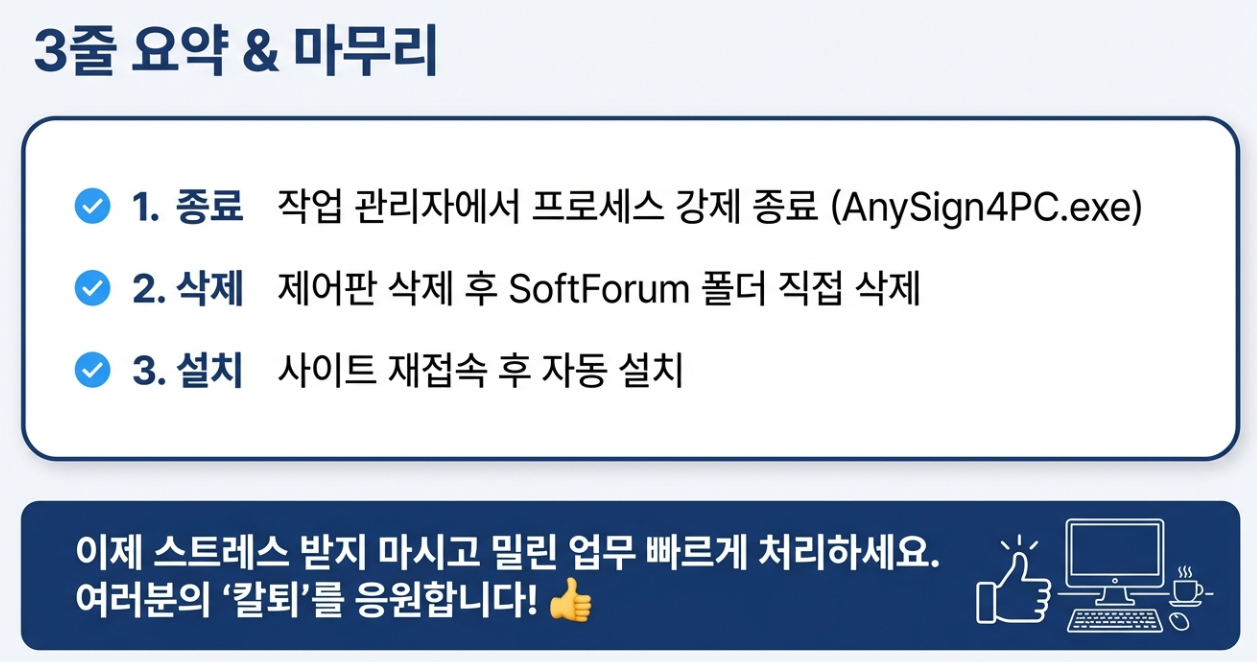 오늘은 이렇게 속 썩이는 AnySign4PC 무한 로딩 오류를 시원하게 해결하는 방법을 알아봤습니다. 이제 스트레스 받지 마시고 밀린 업무 빠르게 처리하시길 바랄게요!
