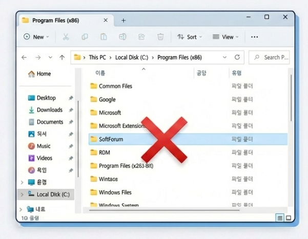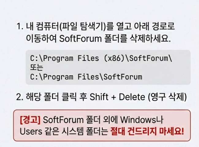 'SoftForum' 폴더 외에 다른 시스템 폴더(Windows, Users 등)는 절대 건드리시면 안 됩니다! 오직 SoftForum 폴더만 타겟팅해 주세요.