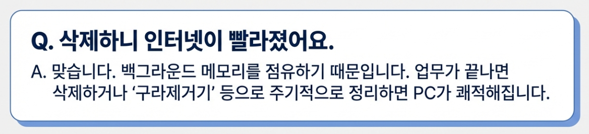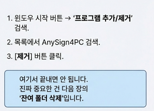 이제 녀석을 잠재웠으니, 깔끔하게 삭제할 차례입니다. 단순히 제어판에서 지우는 것뿐만 아니라, 남아있는 찌꺼기 폴더까지 지워야 무한 로딩이 재발하지 않아요.