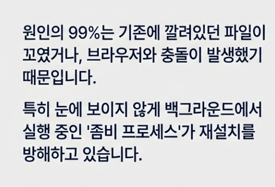 이게 단순히 컴퓨터가 느려서가 아니에요. 기존에 깔려있던 파일이 꼬였거나, 브라우저랑 충돌이 나서 그런 경우가 99%입니다. 오늘 제가 컴퓨터 포맷 없이, 딱 3분 만에 이 지긋지긋한 오류를 해결하는 방법을 아주 쉽게 알려드릴게요. 팔로 미! 😎