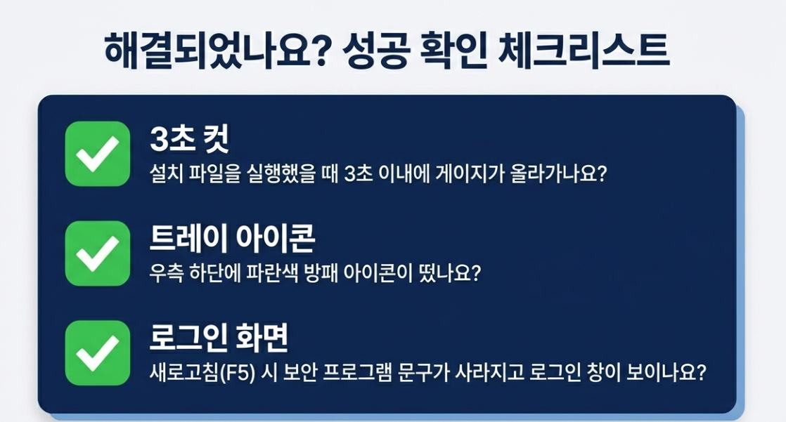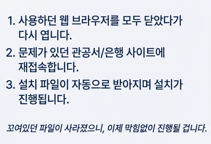 이제 깨끗한 상태에서 해당 관공서/은행 사이트에 재접속하면 설치 파일이 자동으로 받아질 겁니다. 설치 후 아래 체크리스트를 통해 문제가 완전히 해결됐는지 확인해 보세요.