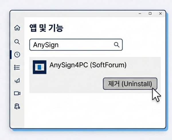윈도우 시작 버튼을 누르고 '프로그램 추가/제거'를 검색해서 들어갑니다. 목록에서 AnySign4PC를 찾아 제거 버튼을 눌러주세요.