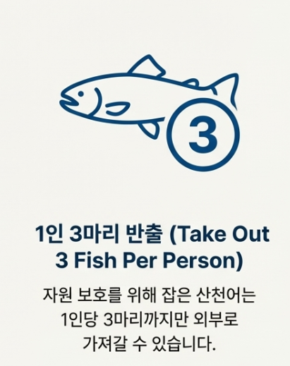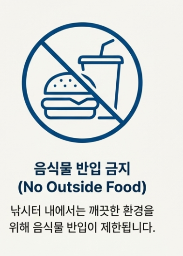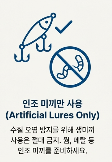 낚시터 내에서는 음식물 반입이 금지되어 있습니다. 또한, 생미끼는 수질 오염 방지를 위해 절대 사용할 수 없으니 웜이나 메탈 같은 인조 미끼를 준비하셔야 해요!