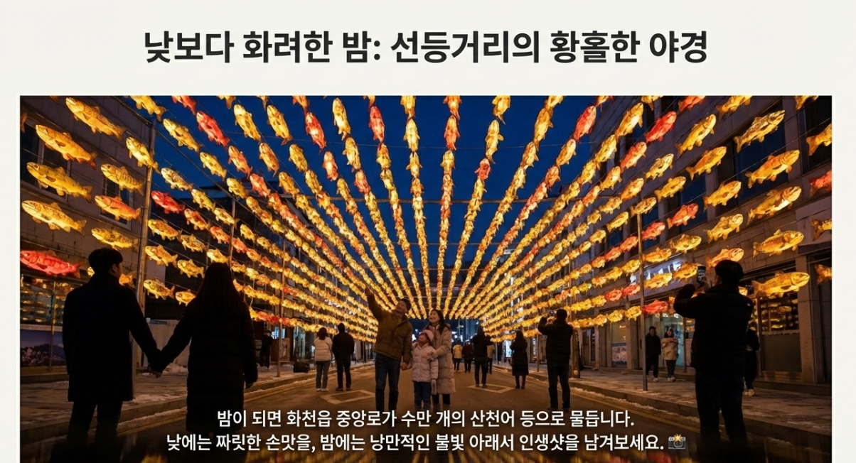 밤이 되면 화천읍 중앙로 선등거리는 화려한 산천어 등으로 물듭니다. 낮에는 낚시를 즐기고, 밤에는 낭만적인 불빛 아래서 인생샷을 남겨보세요.