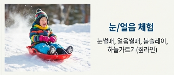 | 눈/얼음 체험 | 눈썰매, 얼음썰매, 봅슬레이, 하늘가르기(짚라인) | 아이들이 특히 좋아해요 |