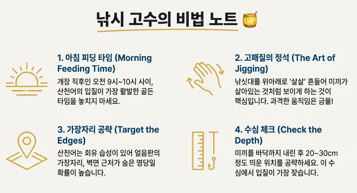 - 고패질의 정석: 낚싯대를 위아래로 살살 흔들어주는 '고패질'이 생명! 너무 과격하게 흔들면 물고기가 도망가요.