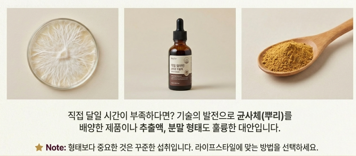 요즘은 기술이 좋아져서, 균사체(뿌리)를 배양한 제품들도 많이 나와요. 바쁜 현대인이라면 굳이 달이지 않아도 되는 추출액이나 분말 형태도 훌륭한 대안이 될 수 있답니다.