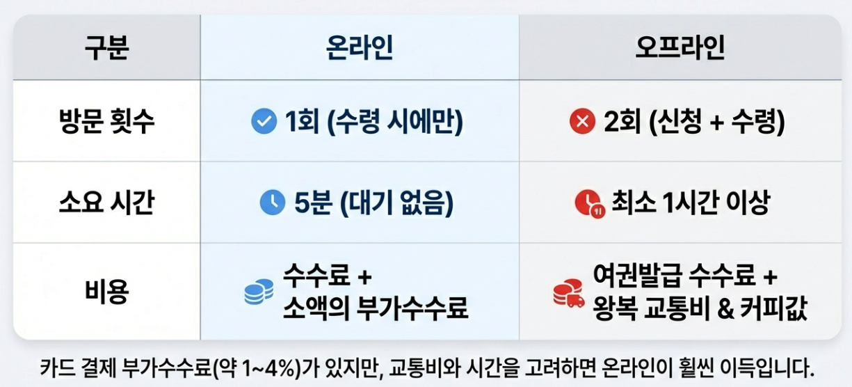 | 수수료 | 여권발급 수수료 + 부가수수료(약 1~4%) | 여권발급 수수료만 발생 |