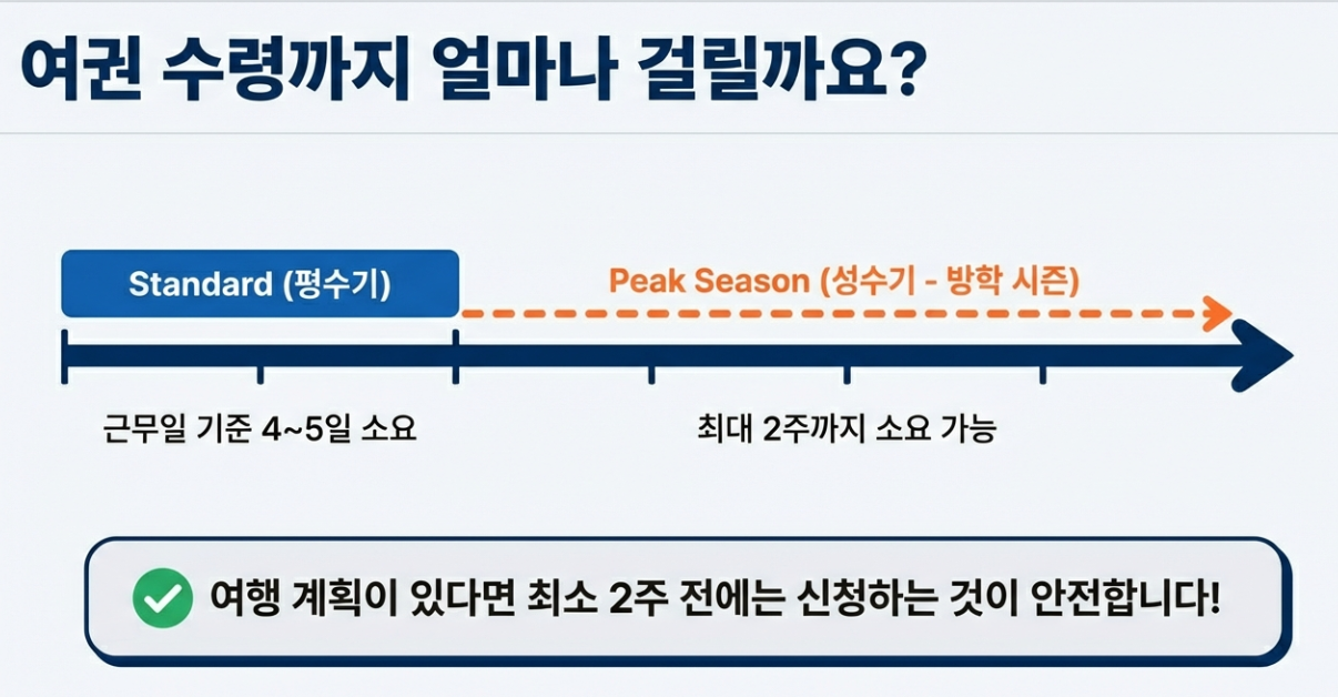 보통 신청일로부터 근무일 기준 4~5일 정도 걸려요. 하지만 성수기(여름/겨울 방학 시즌)에는 2주까지 걸릴 수도 있으니, 여행 계획이 있다면 최소 2주 전에는 신청하는 게 안전합니다.