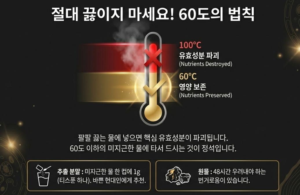 아무리 좋은 것도 잘못 먹으면 꽝이죠! 특히 차가버섯은 '온도'가 생명입니다.