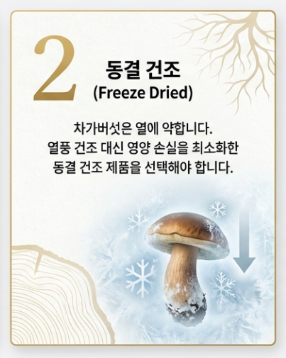차가버섯은 열에 매우 약해요. 열풍 건조한 제품은 영양소가 파괴되었을 확률이 높습니다. 영양 손실을 최소화한 동결 건조(Freeze Dried) 공법인지 확인 필수!
