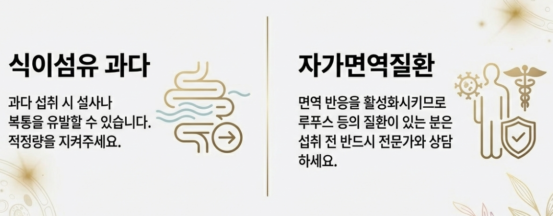 차가버섯은 식이섬유가 많아 과다 섭취 시 설사나 복통을 유발할 수 있어요. 또한, 면역 반응을 활성화하기 때문에 루푸스 같은 자가면역질환이 있는 분들은 섭취 전 반드시 의사와 상담해야 합니다.