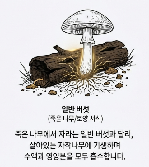 차가버섯은 일반적인 버섯과는 태생부터 달라요. 죽은 나무에서 자라는 다른 버섯들과 달리, 살아있는 자작나무에 기생하며 나무의 수액과 영양분을 몽땅 빨아먹고 자라거든요. 그래서 별명이 '자작나무의 암' 혹은 '숲속의 깡패'라나요?